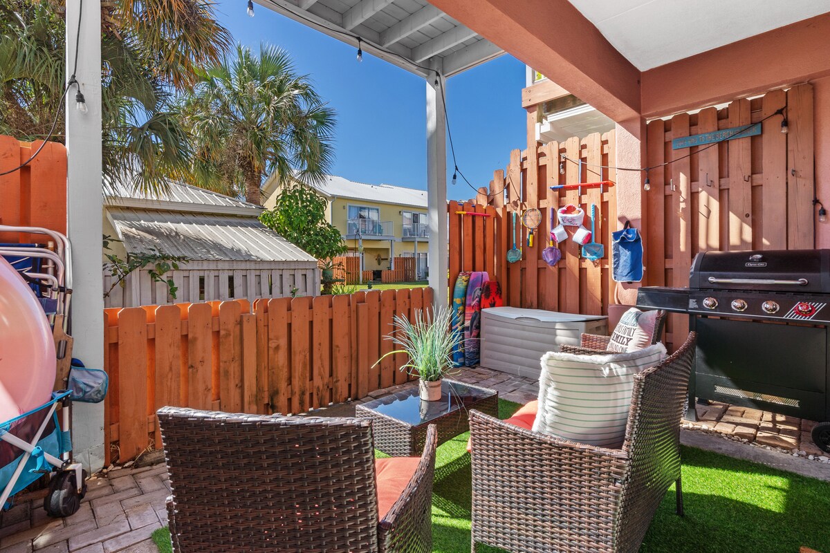 Outside: Wake up each morning and enjoy a freshly brewed cup of coffee on your private, covered patio or 2nd-level private balcony. Take in the lovely pool views while relaxing or eating breakfast on the patio. Our back patio overlooks the Gulf Walk shared pool.